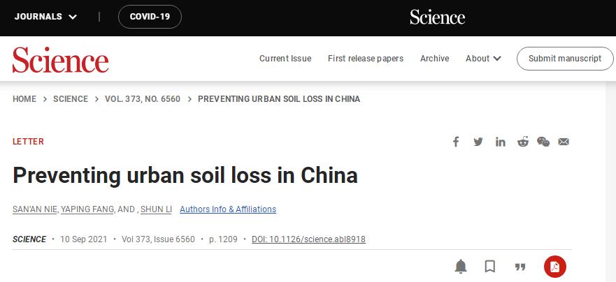 San’an Nie, Yaping Fang, Shun Li*, 2021. Preventing urban soil loss in China. Science, 373(6560):1209. DOI: 10.1126/science.abl8918